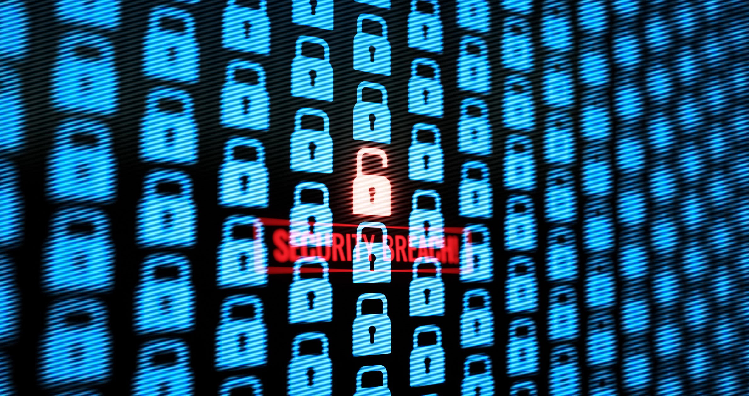 A large monitor displaying a security hacking breach warning.