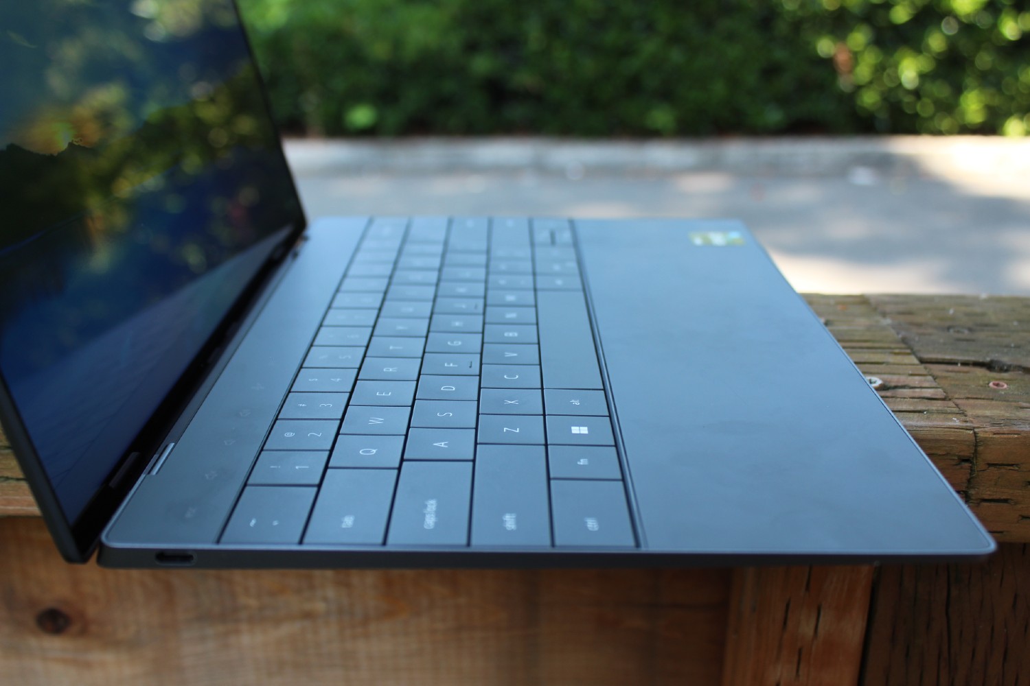 The Dell XPS 13 Plus on a table outside.