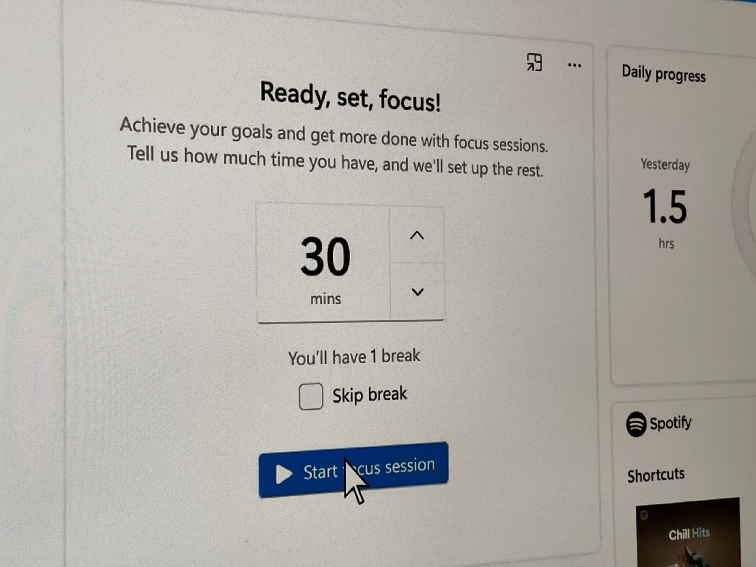 Judging from the video, Windows 11 users can begin Focus Sessions by selecting a task, a song from Spotify, and then setting a timed-focus mode goal with optional breaks in between. The session will then begin, show a countdown timer, and can be tracked against overall daily progress. That daily progress will show a daily goal, a streak, as well as focus minutes and hours from the day before.