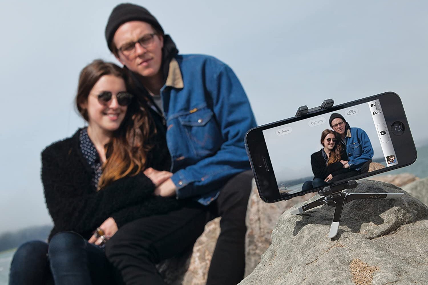Manfrotto is a famous brand in the photography realm, so it’s no surprise it’s also in on the smartphone act. The Manfrotto Pixi Mini Tripod Kit comes with a universal smartphone clamp, designed to be unobtrusive for shoots where a full-size tripod isn’t needed or wanted. This mini-tripod provides a stable base for the camera to frame your subject and create clean, smooth images. Its tiny size lets you tote it wherever you’re headed without getting loaded down. It has adjustable legs and rubber-padded feet to protect the most delicate surfaces and maintain a steady grip.