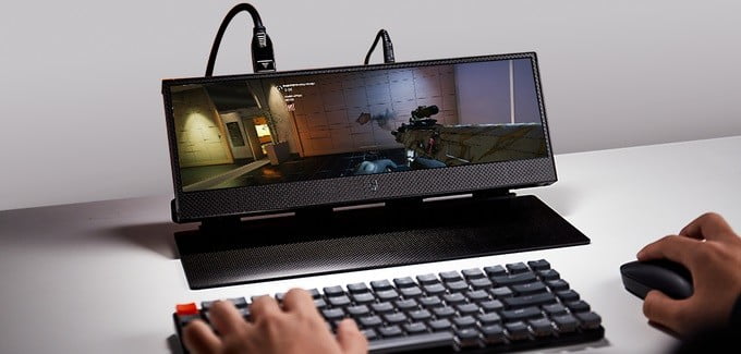 The company advertises the monitor as a one-of-a-kind portable display, and just one look at the photos proves that yes, this is a unique model. It has an odd aspect ratio of 32:9, measures 14-inches, and has a resolution of 3840 x 1100. It can be rotated to be horizontal or vertical, and the protective stand it’s attached to offers multiple angle adjustments.