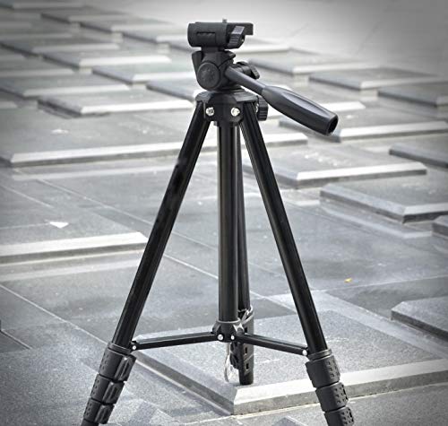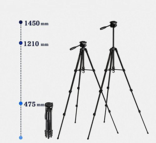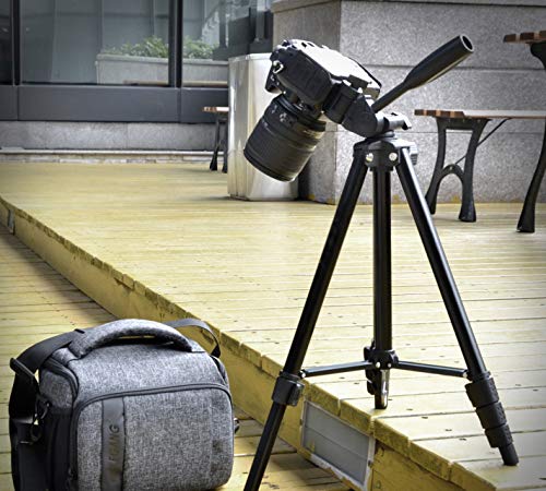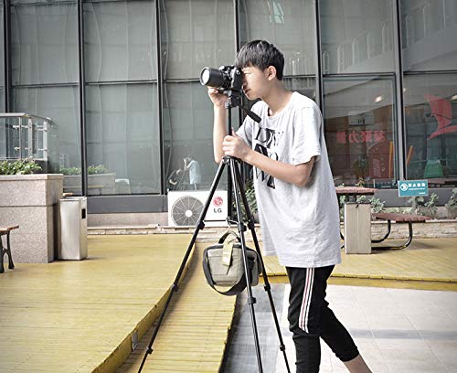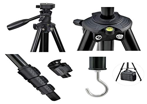 360°Telescopic Pan Handle, Large Handle for Carrying Conveniently, Flip-Locks for Leg Height Adjustment, knobs & Non-slip Pongee/Rubber Mats for Strong Stability, Center column hook for Hanging Additional Accessories/Adding Weight to the Tripod for Additional Stabilization. A Carrying Bag